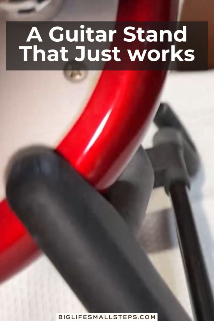 - I keep mine right beside my desk so my guitar is always within reach. When I’m done playing, it folds up flat in seconds and tucks neatly behind a chair. The rubber padding on the legs and backrest keeps the guitar from slipping or getting scratched.